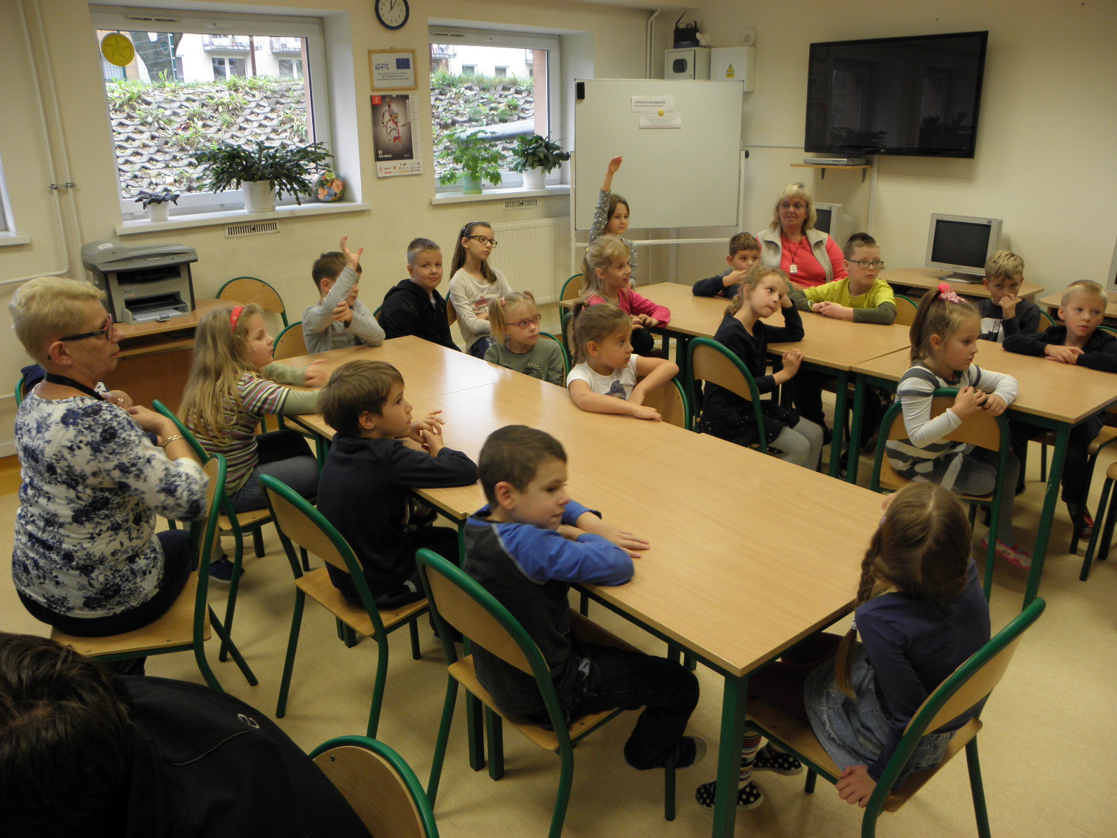 W dniu 20 października 2016r. dzieci ze świetlicy szkolnej odwiedziły szkolną bibliotekę. Poznaliśmy Panie bibliotekarki, które opowiedziały nam dużo o swojej pracy i pracy biblioteki. Dowiedzieliśmy się, że w zbiorach naszej biblioteki jest 24 tys. książek, o różnorodnej tematyce. Panie opowiedziały nam również jak można zostać członkiem szkolnej biblioteki. Czas spędzony między bogatym księgozbiorem minął w miłej atmosferze. Na zakończenie zaśpiewaliśmy wspólnie piosenkę pt. " Książeczka" i wypożyczyliśmy książkę, do wspólnego poczytania w świetlicy pt. "Medor".
